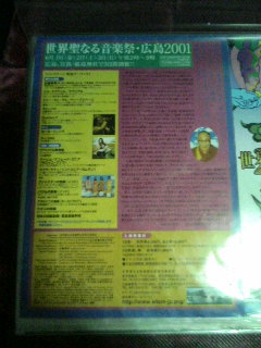 その後、岡山市内の今は無きとある雑貨屋さんで偶然にも竹のディジュに出会い、迷わず格安で購入☆私のディジュ人生が始まった訳です。今年の9月、滋賀県の山水人で「世界聖なる音楽祭広島2001」にスタッフとして参加していたという人や、遊びに行ってたという人達で何人か出会えた。6年越しの再会を果たした気分。めっさ嬉しくなりました。結局予定されたいた記録DVDの発売はなく、主催者の近藤等則さんの悪評ばかりが聞こえてきますが、今の自分を発見できたあのお祭りに参加出来た事を私は誇りに思います。